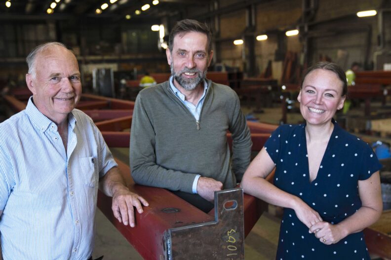 Henriette Carstensen (BORI BBL), Jan Ove Hofseth (SLM Revisjon AS) og Per Mathisen (Åkrene Mek. Verksted AS). Her på omvisning i den flotte verkstedhallen til Åkrene Mek. Verksted.
